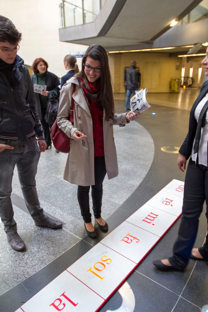 The idea was to trigger the voices of the boys and classical audio tracks by using an interactive keyboard lying on the floor. This was the task in designing the hardware, due the difficult location of the very crowded Gare Saint Lazare subway station in Paris it had to be very robust.