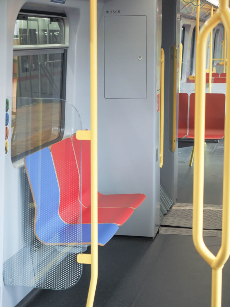 The entry situation is completly reorderd to avoid passerngers crowding next to the door areas. This is reducing passengers turnover time. A blue seat is placed next to every door, which is a signal to keep this seat extra for disabled passengers.